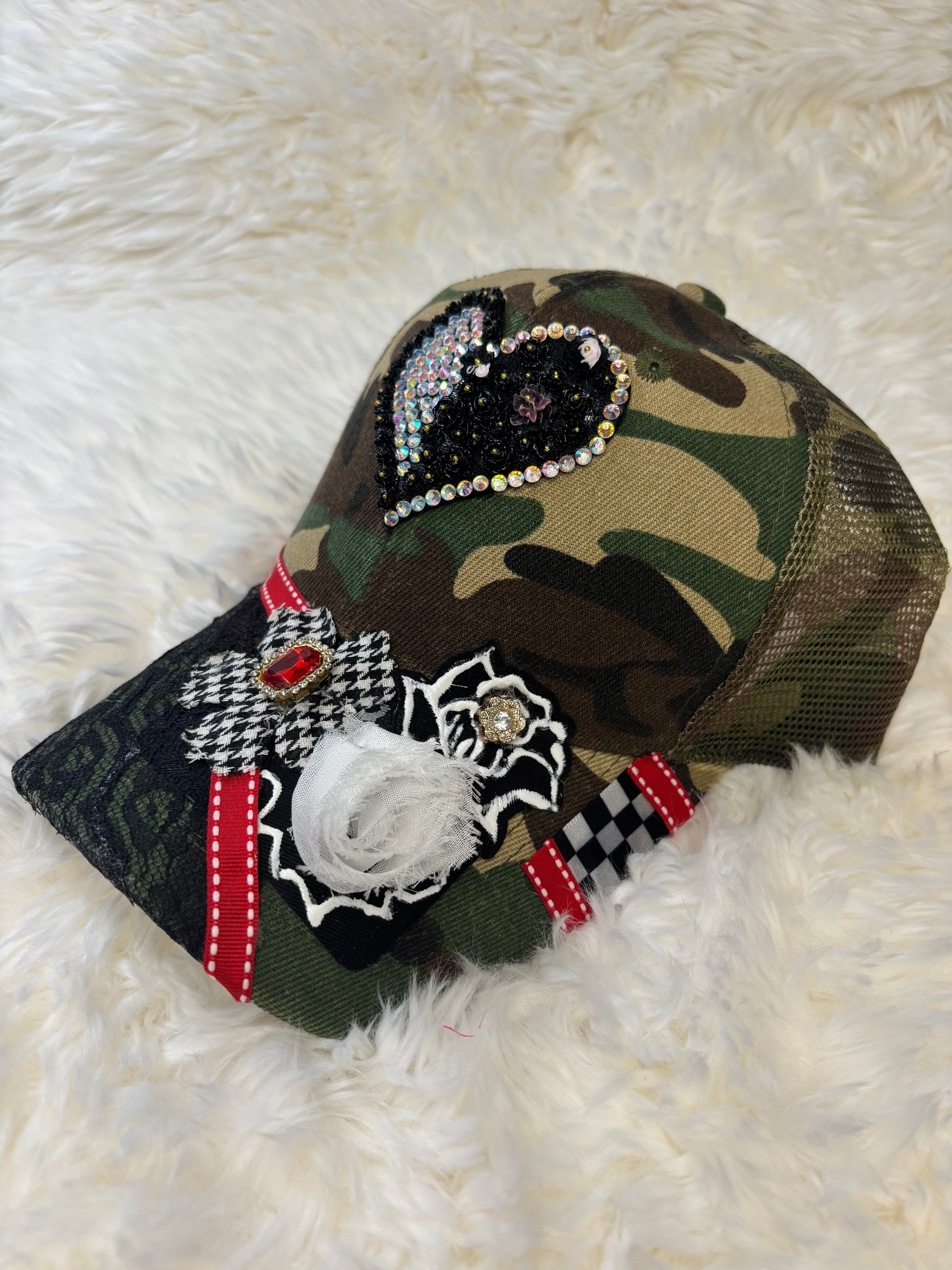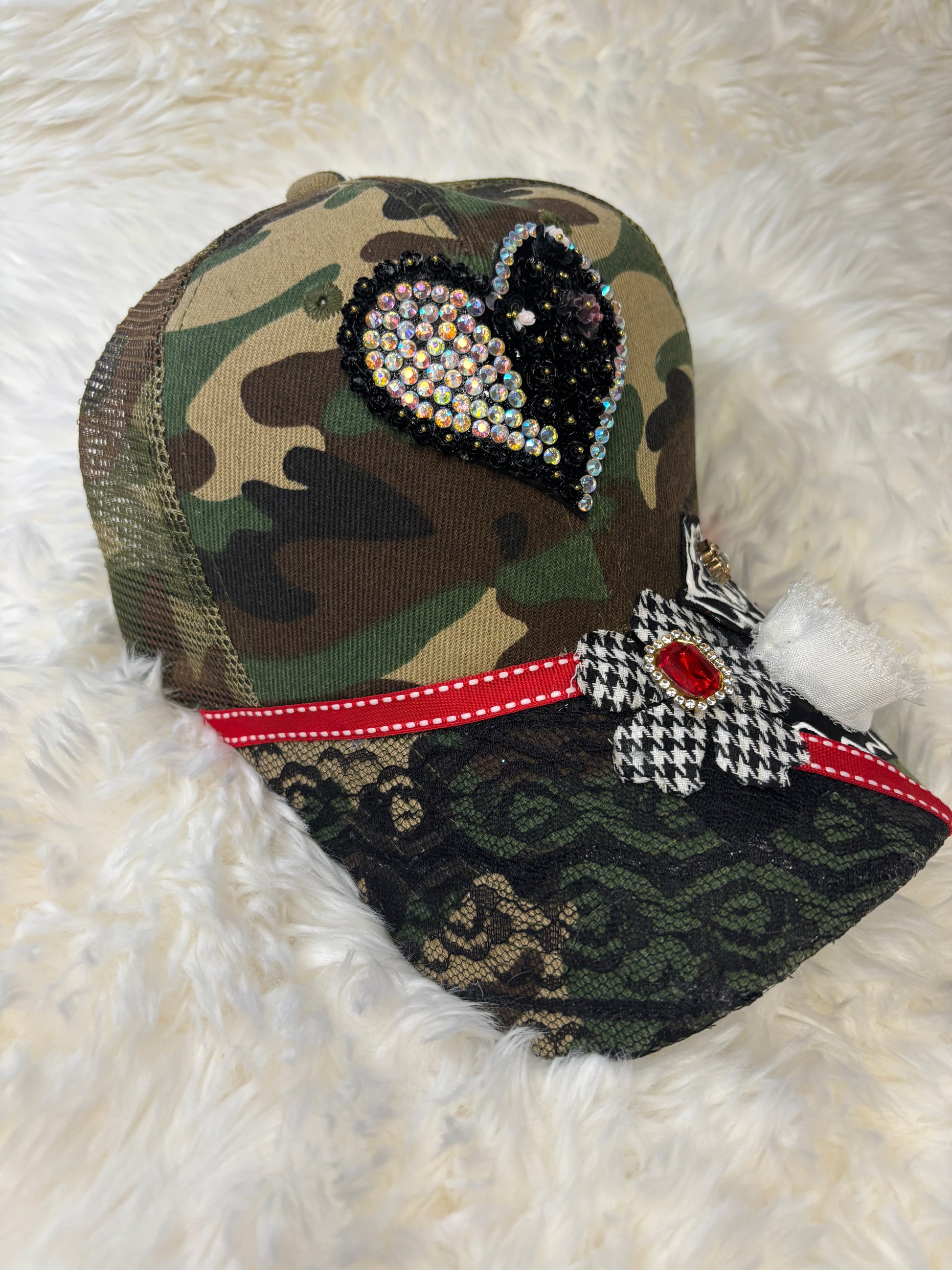 Camo gets a couture remix in the Ari Justice cap…a fearless clash of grit and glam. Featuring a crystal-studded black heart applique, vintage houndstooth florals with ruby and diamond-style accents, and a mix of checkerboard and polka dot ribbon trims. A bold lace overlay finishes the brim, while hand-layered textures add undeniable attitude. This one’s for the rule-breakers and risk-takers.