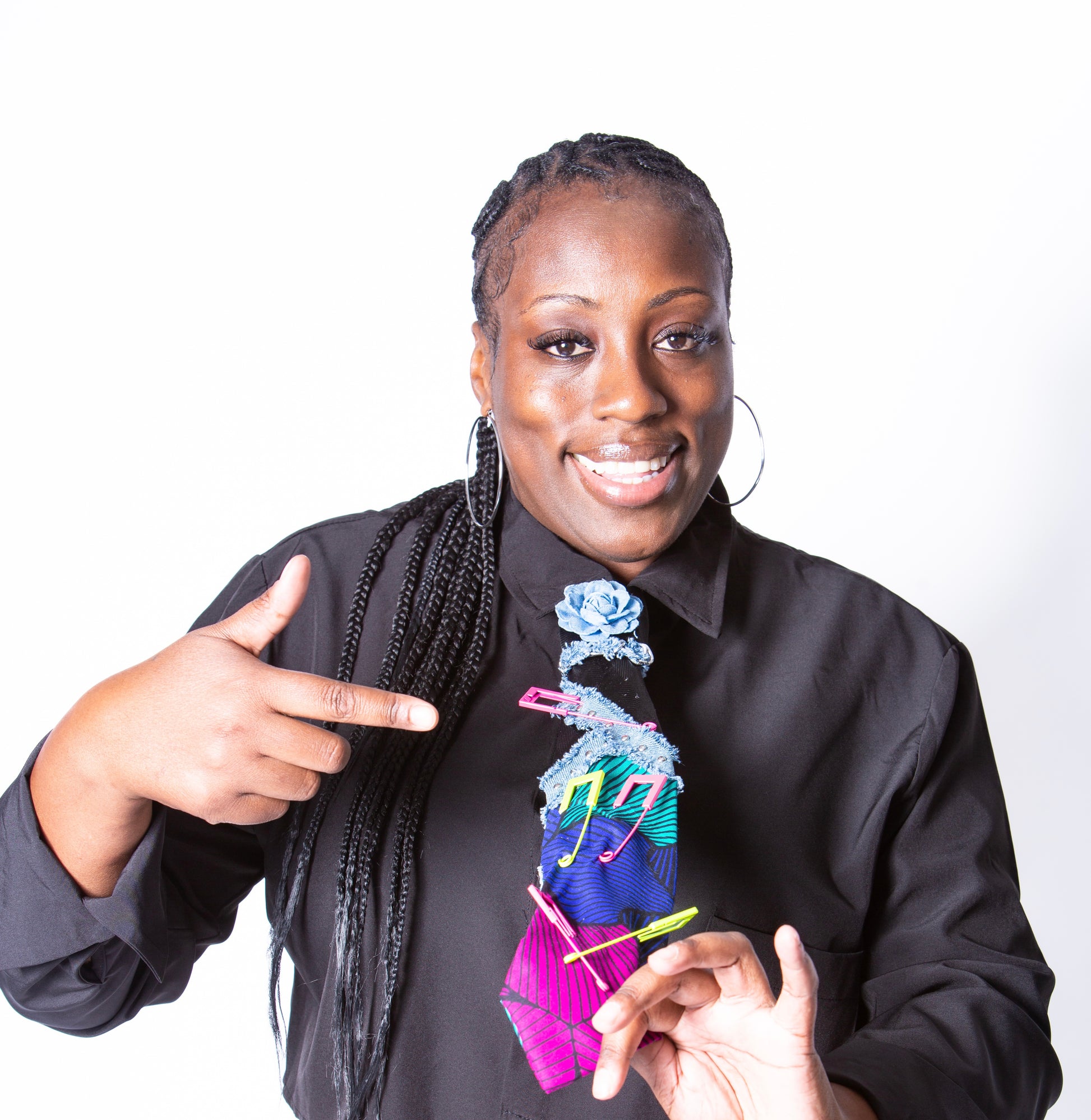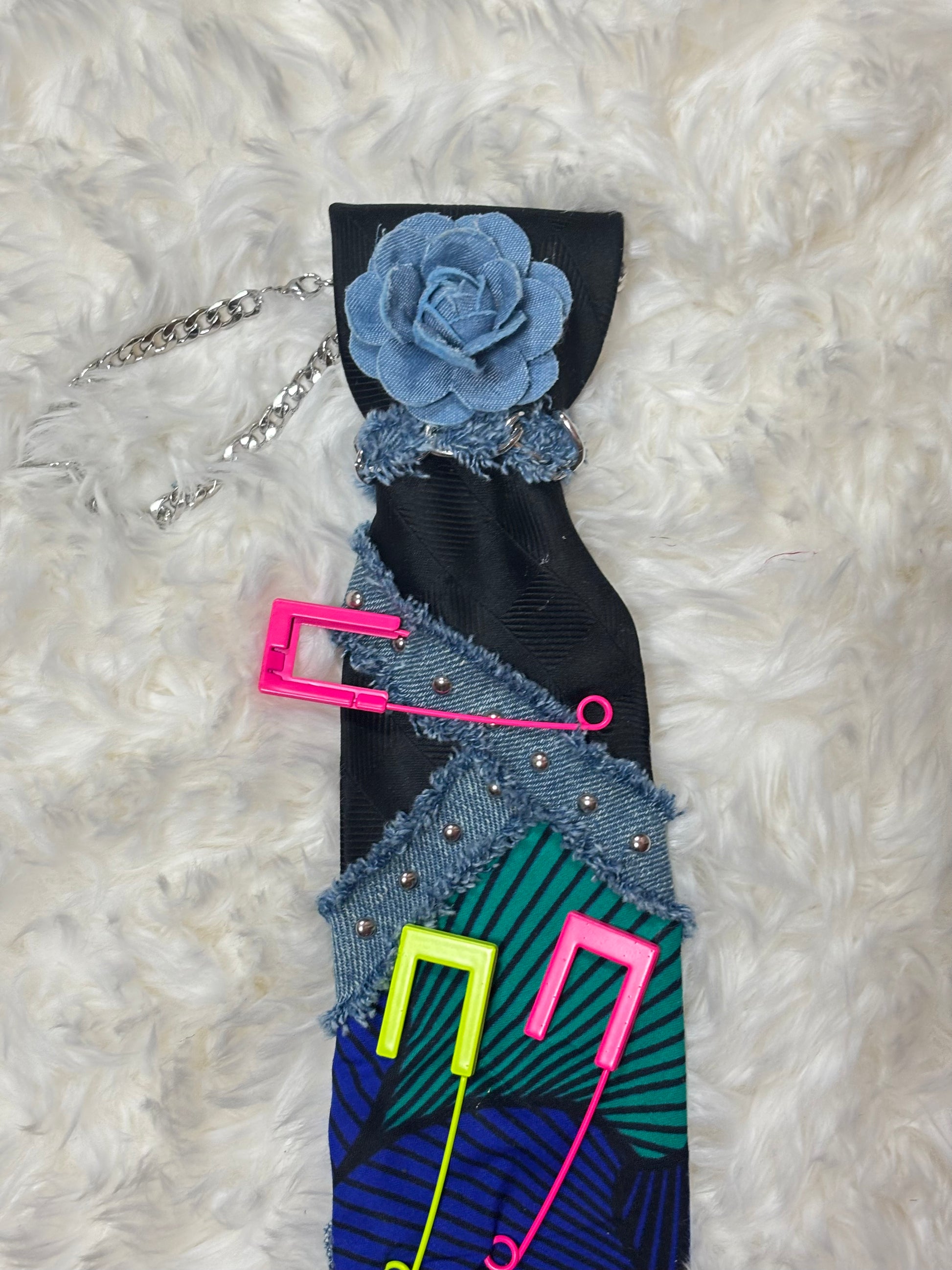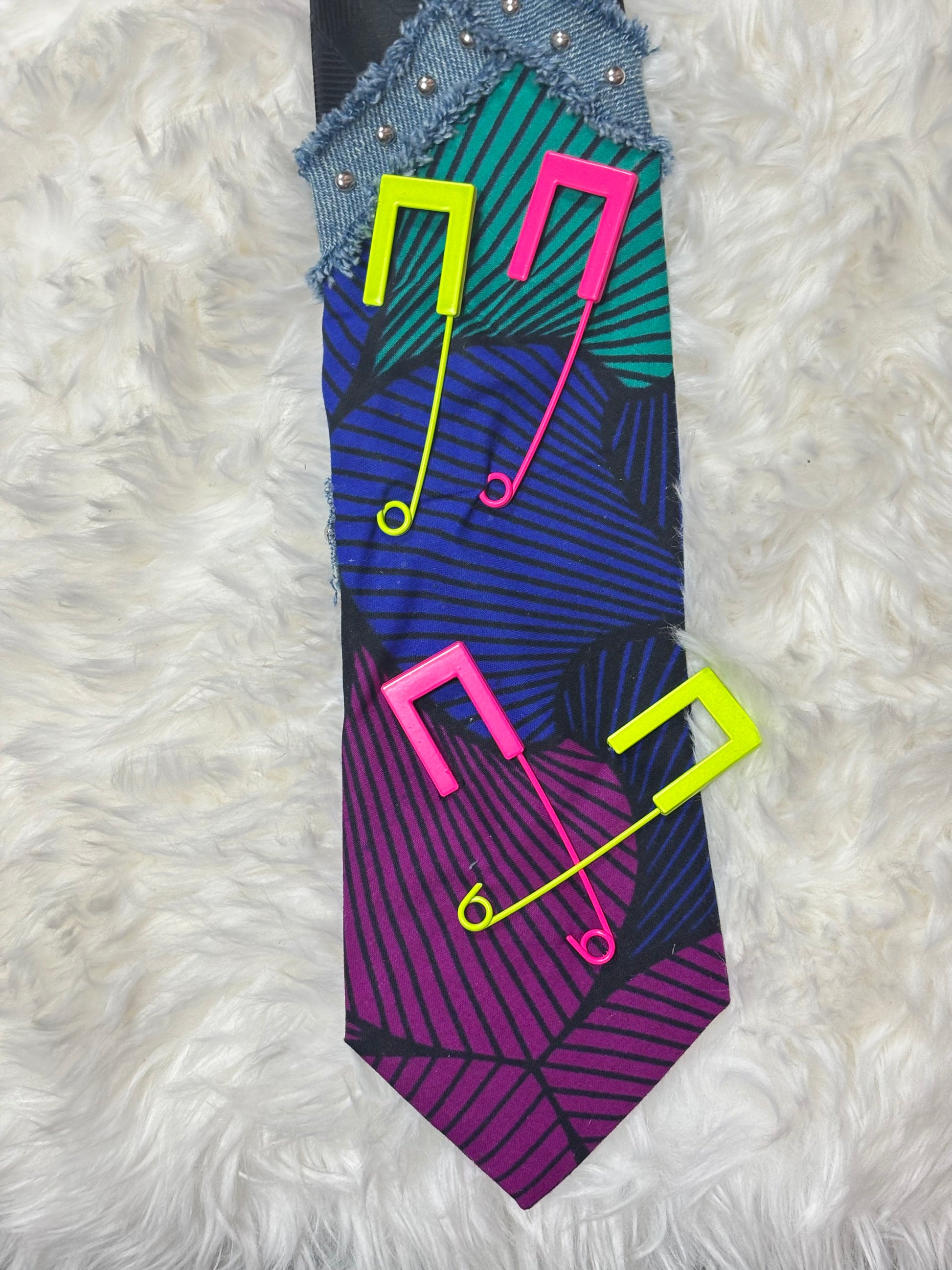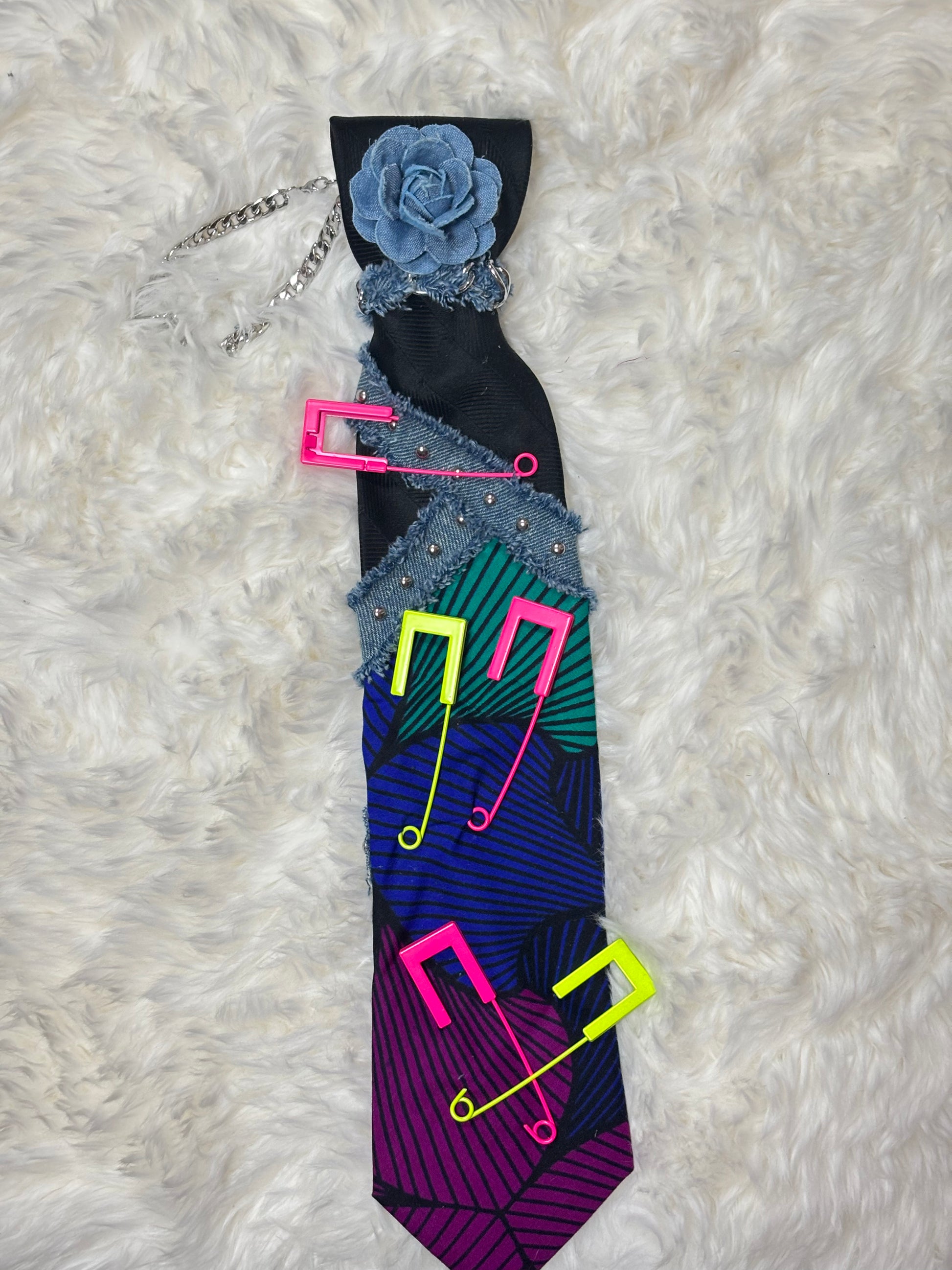 The Avery Knight tie is a fearless blend of edge and artistry. Featuring a bold denim rose accent at the knot, layered distressed studded denim detailing, and vibrant neon oversized safety pins across geometric patterns, this one-of-a-kind piece redefines style. Finished with a stainless steel chain, it’s a statement accessory for those who dare to stand out.
