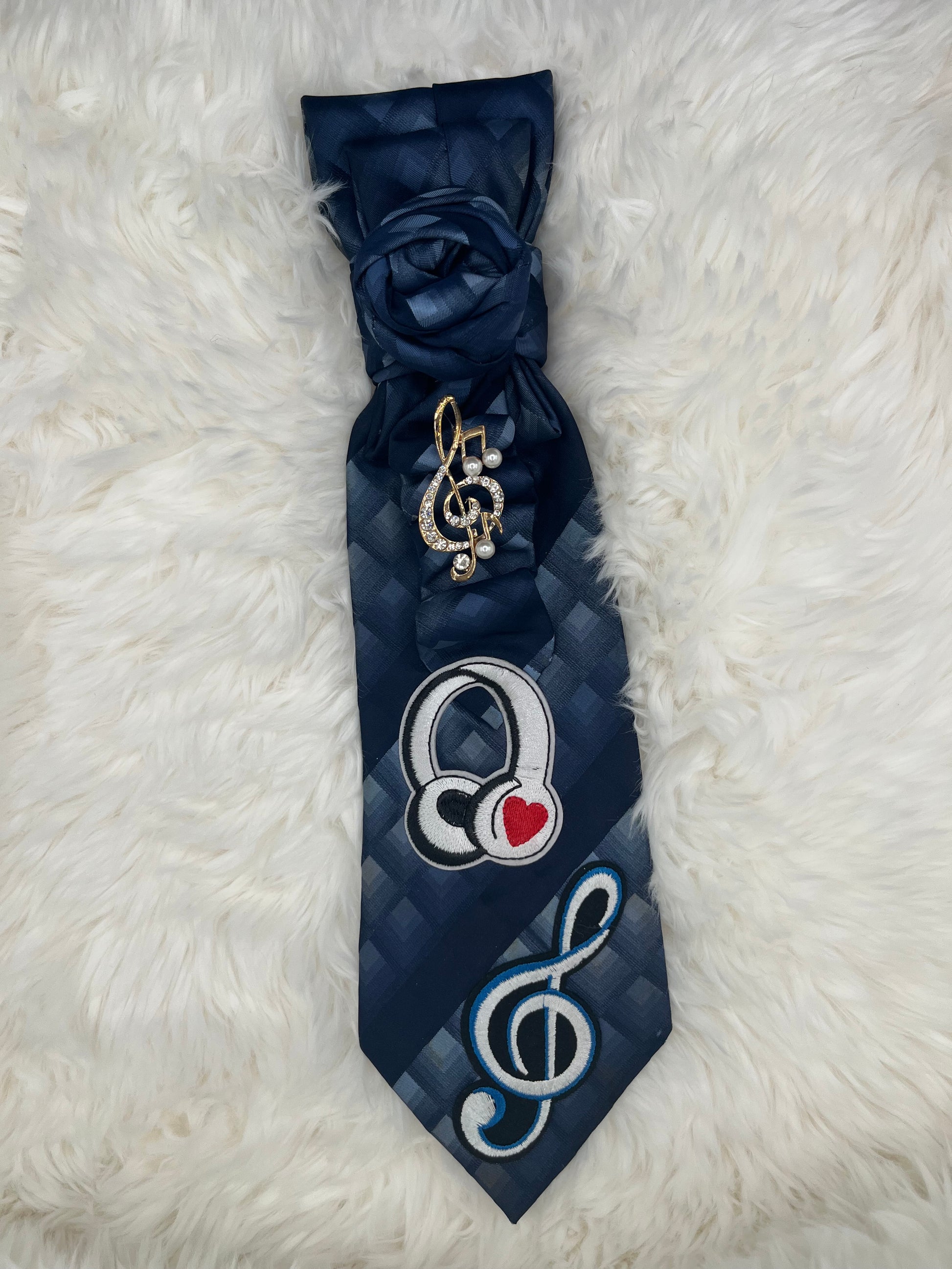 Hit every high note in style with the Maysa Heart Tie. This navy satin tie features a sculpted rose knot, gold rhinestone treble clef brooch with pearl details, embroidered headphones with a pop of red heart, and a bold treble clef patch outlined in blue. Perfect for music lovers, performers, or anyone whose style sings louder than words.