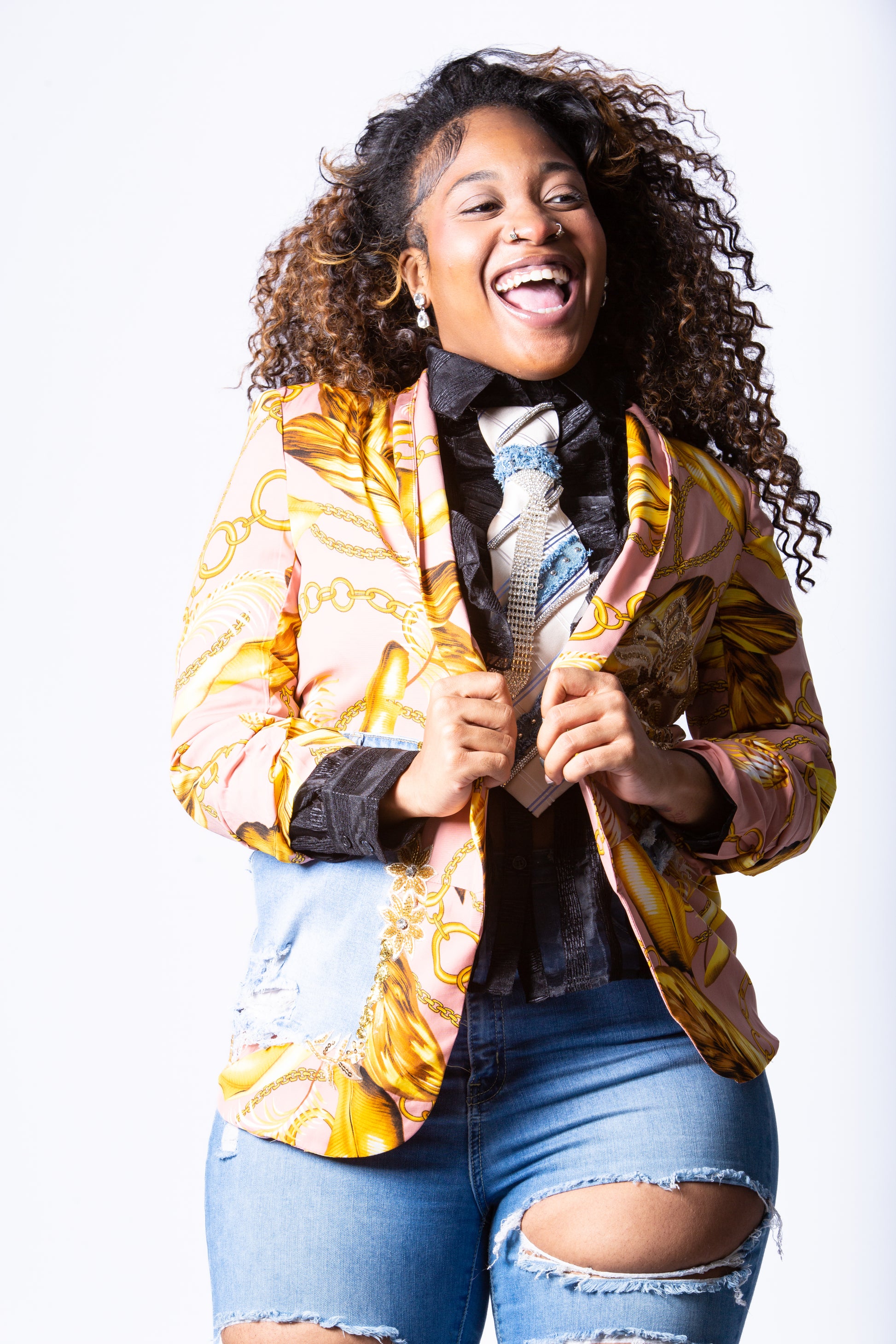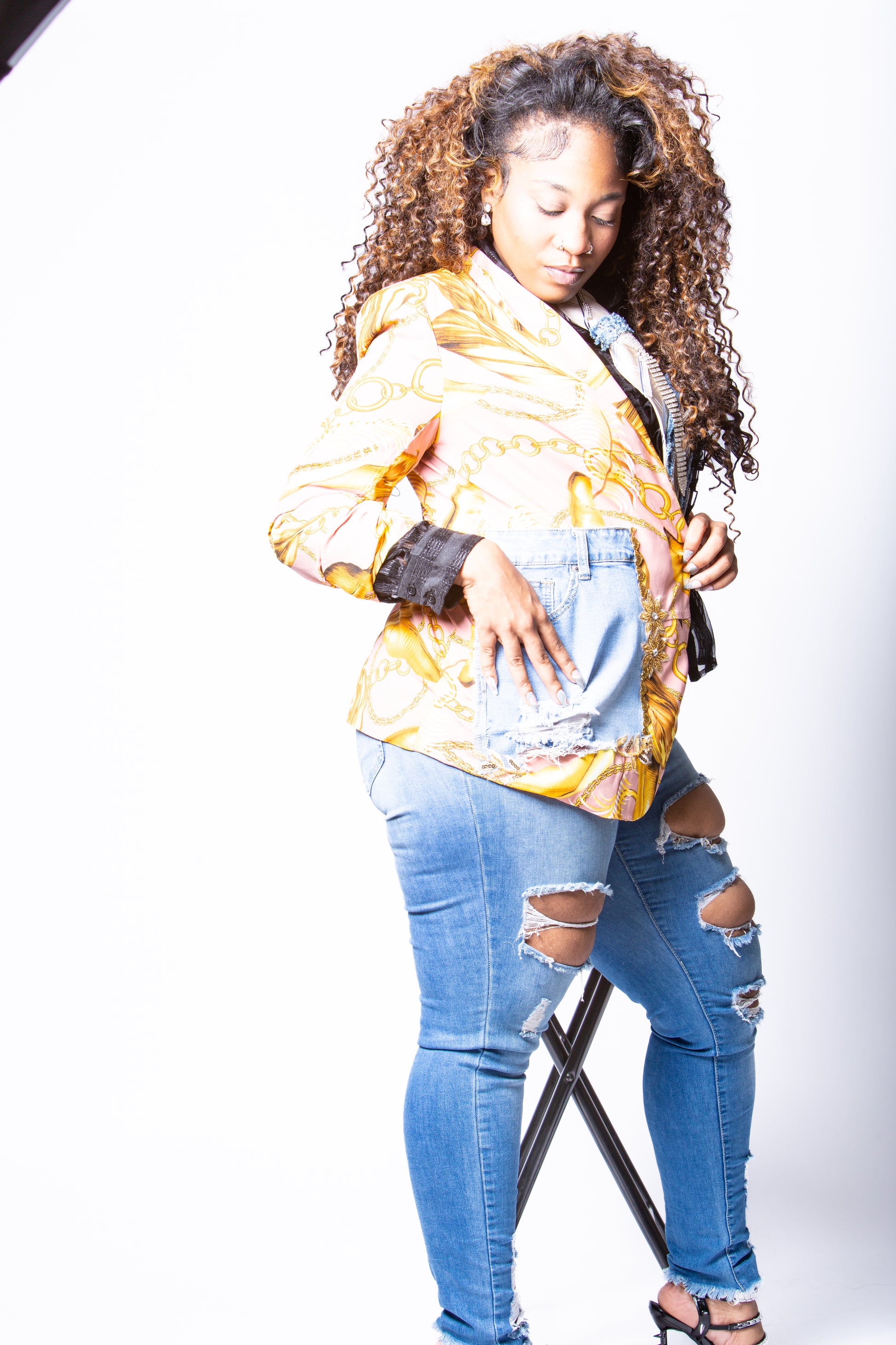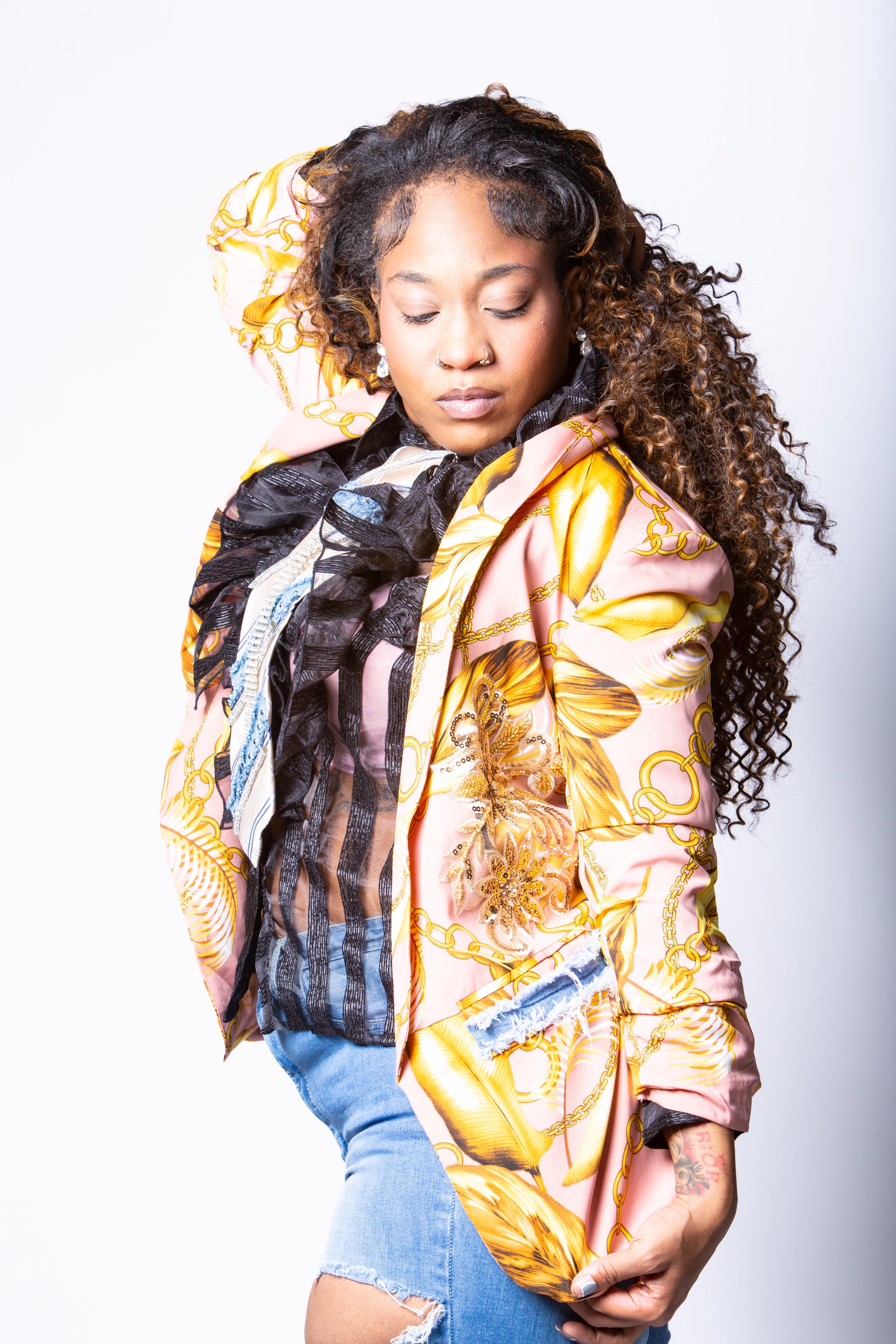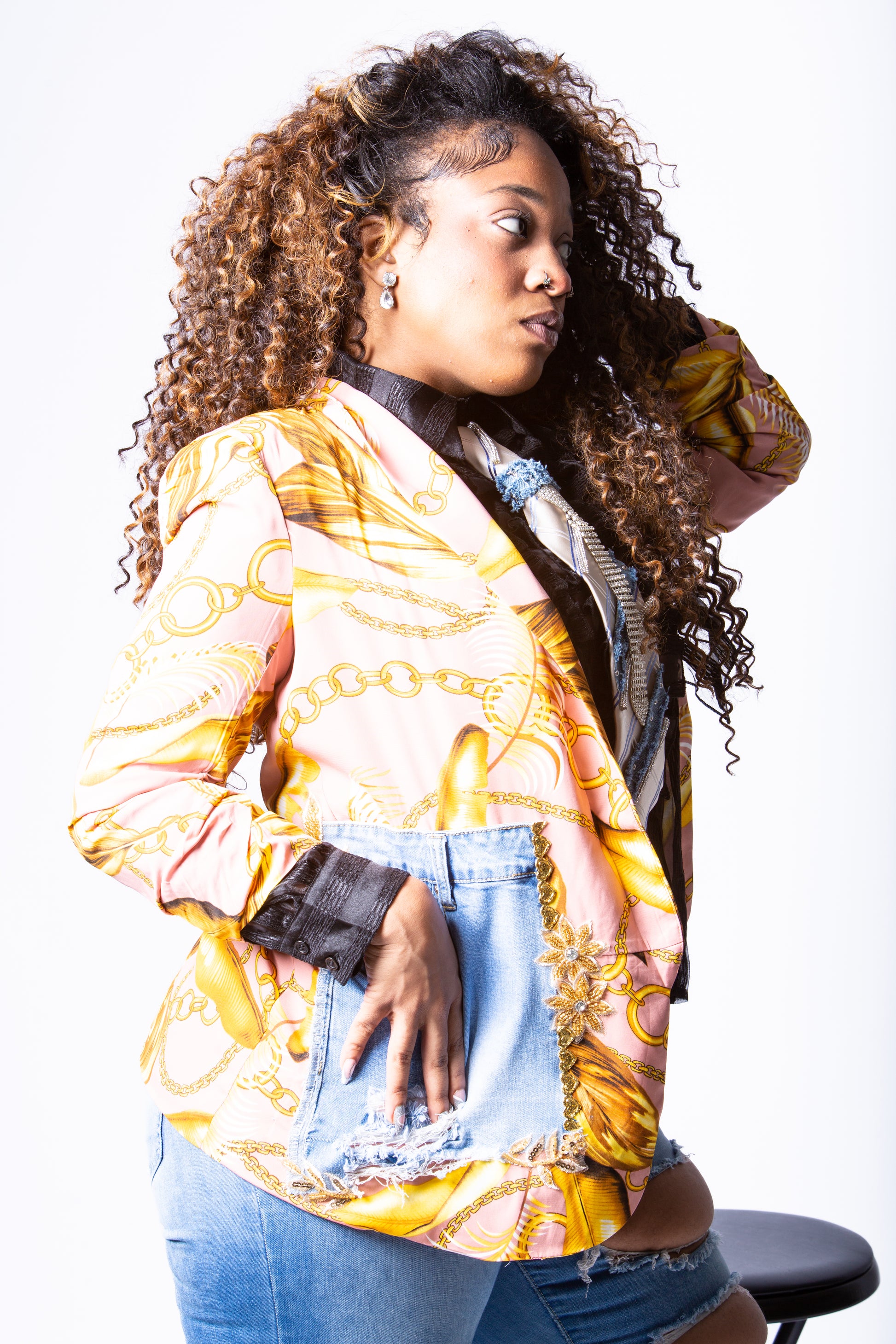 The Mariah James Blazer is a fearless fusion of luxury and edge. Crafted in a striking blush and gold chain-print fabric, it’s elevated with hand-applied sequin floral appliqués and distressed denim patchwork accents. Featuring ruched sleeves, raw-edge details, and a bold reimagining of pocket design, this blazer is a one-of-a-kind statement piece that turns classic tailoring into wearable art. Perfect for the trendsetter who thrives on standing out.