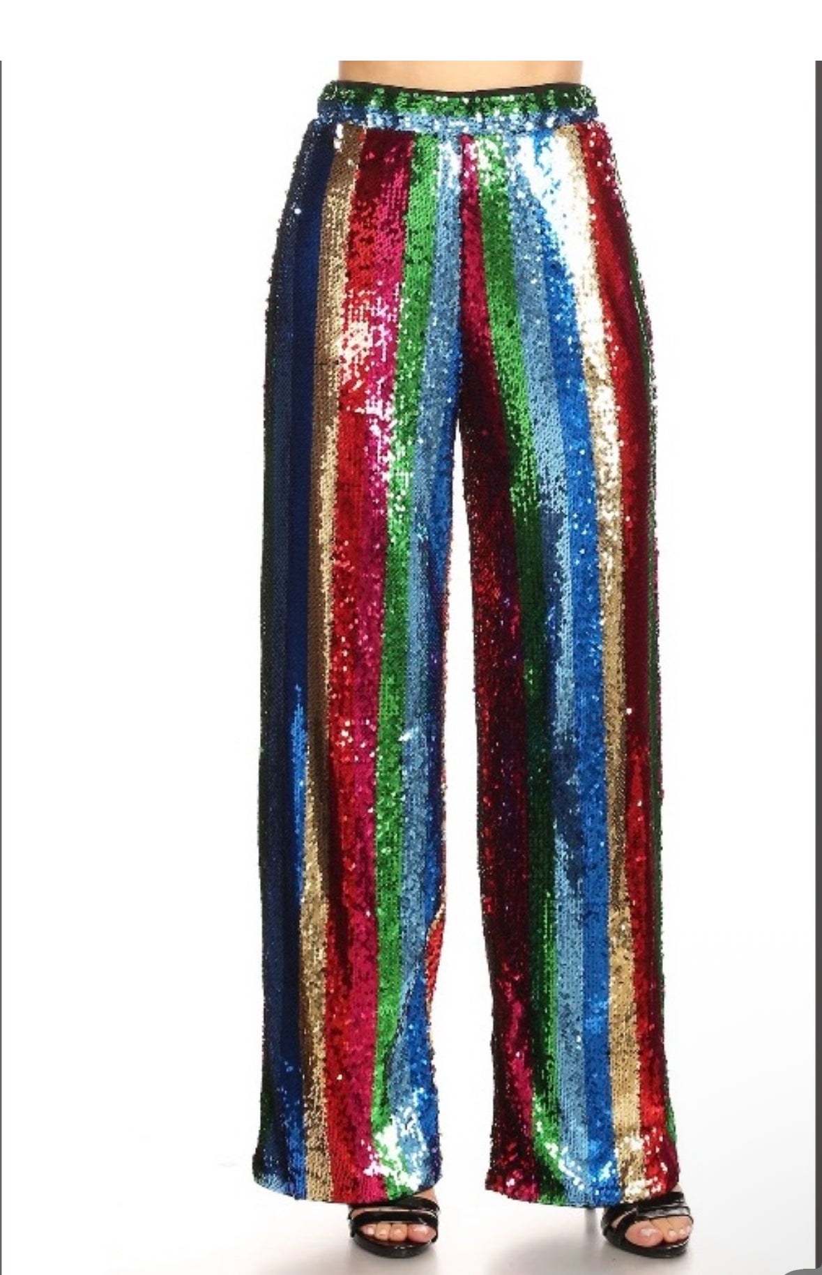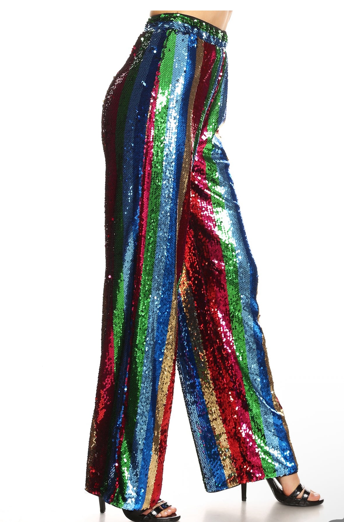 Step into the spotlight with these bold, wide-leg sequin pants featuring vertical stripes in vibrant jewel tones of red, blue, green, and gold. Designed for maximum sparkle and movement, they’re perfect for making a dramatic entrance at parties, events, or any night you want to stand out. High-waisted for a flattering fit, these pants embody fearless style and unapologetic confidence.