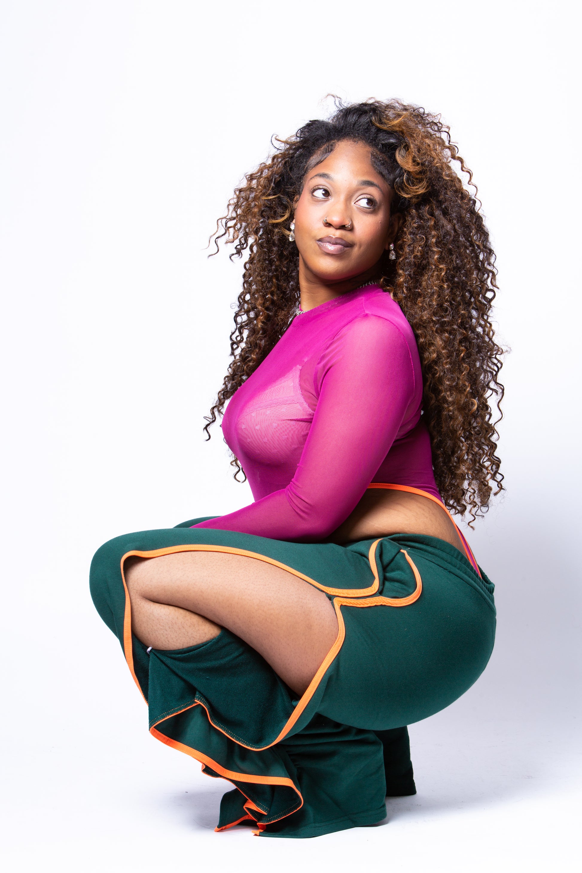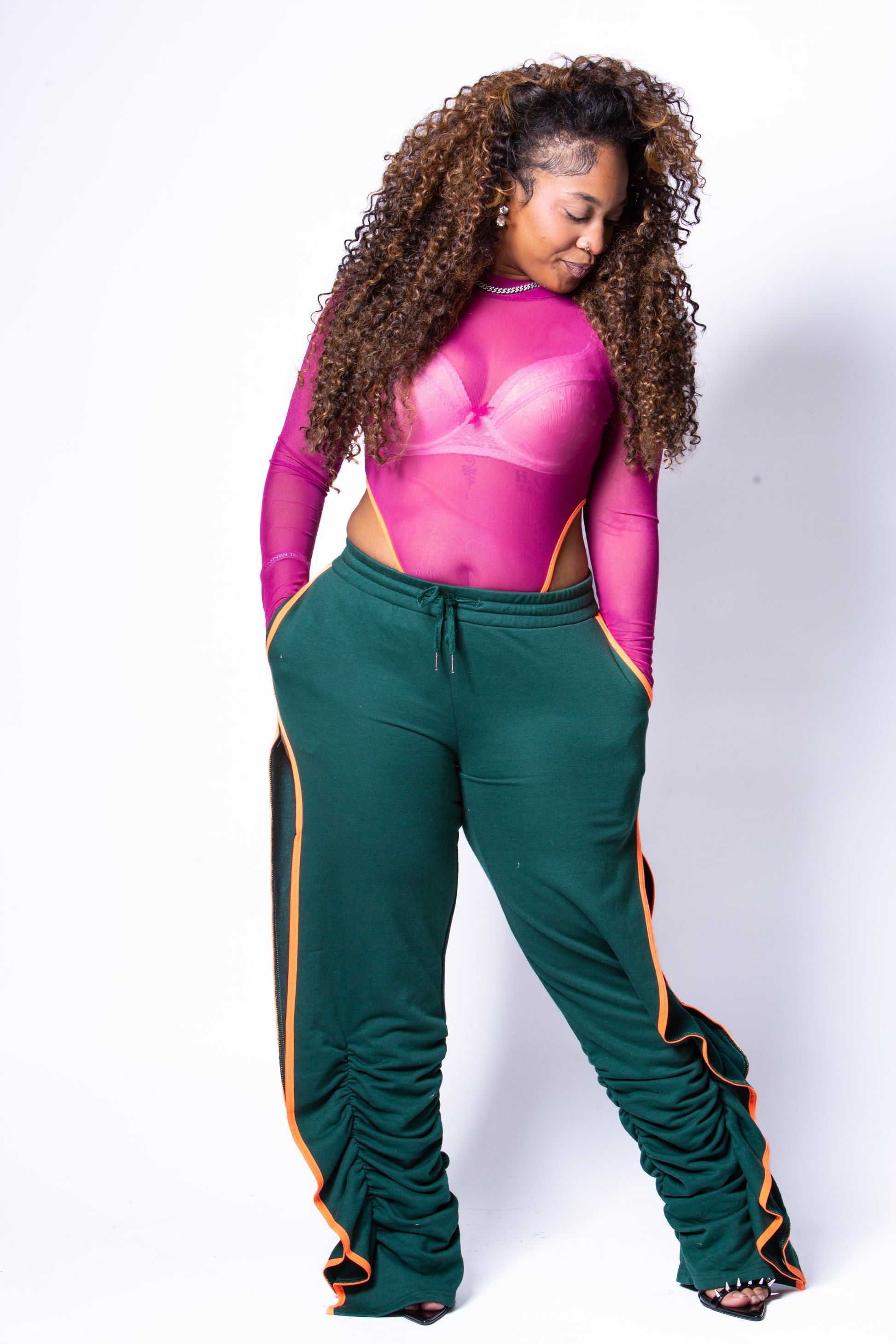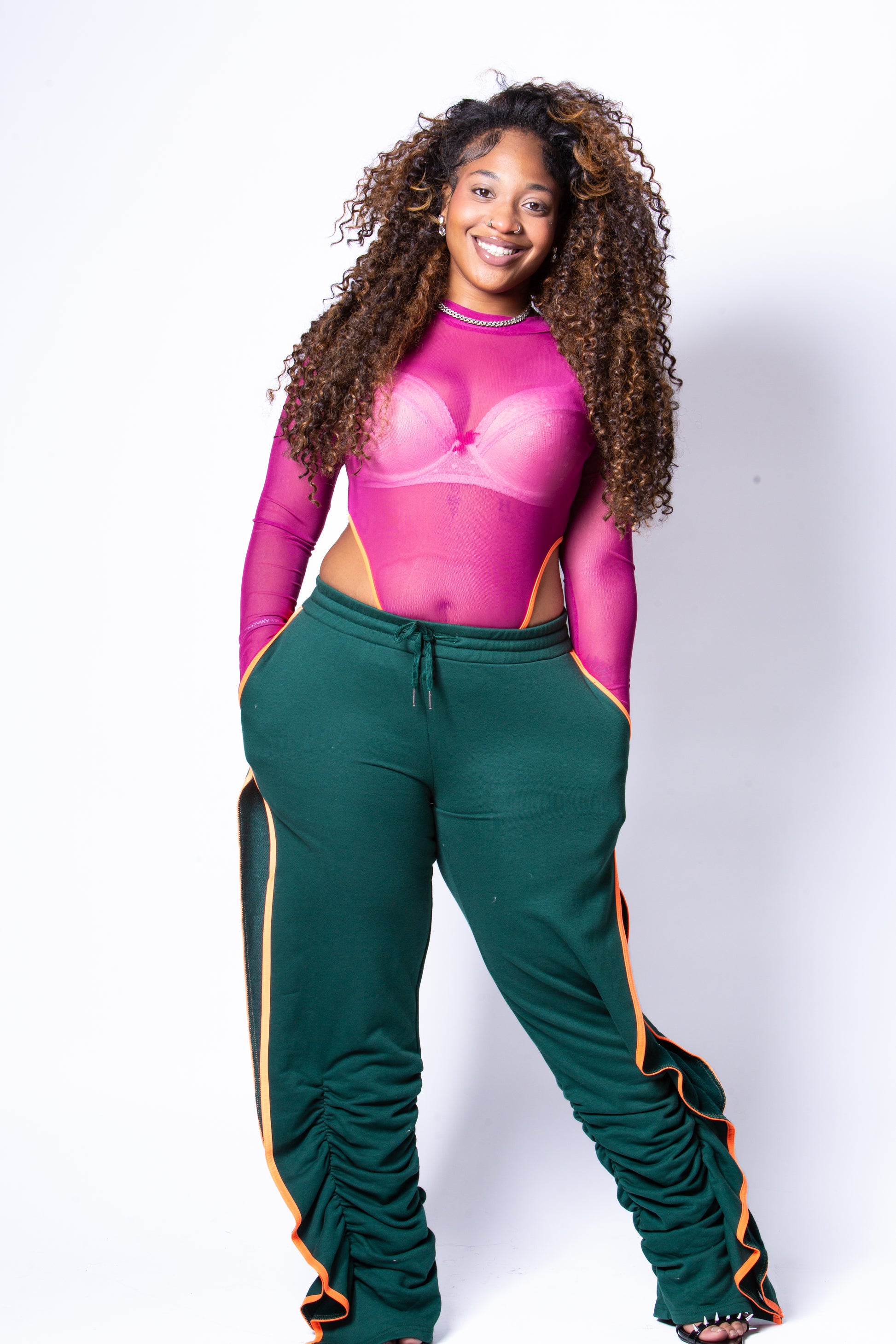 A fearless mix of color, texture, and energy. The sheer fuchsia mesh top, finished with sleek orange trim, delivers confidence and edge while offering a playful peek-through effect. Paired with deep green ruched pants, outlined in bold orange piping and detailed with daring side cutouts, this set is built for movement and impact. Designed to blend comfort with statement-making style, the Marrii Gurl Set brings runway energy to everyday wear.