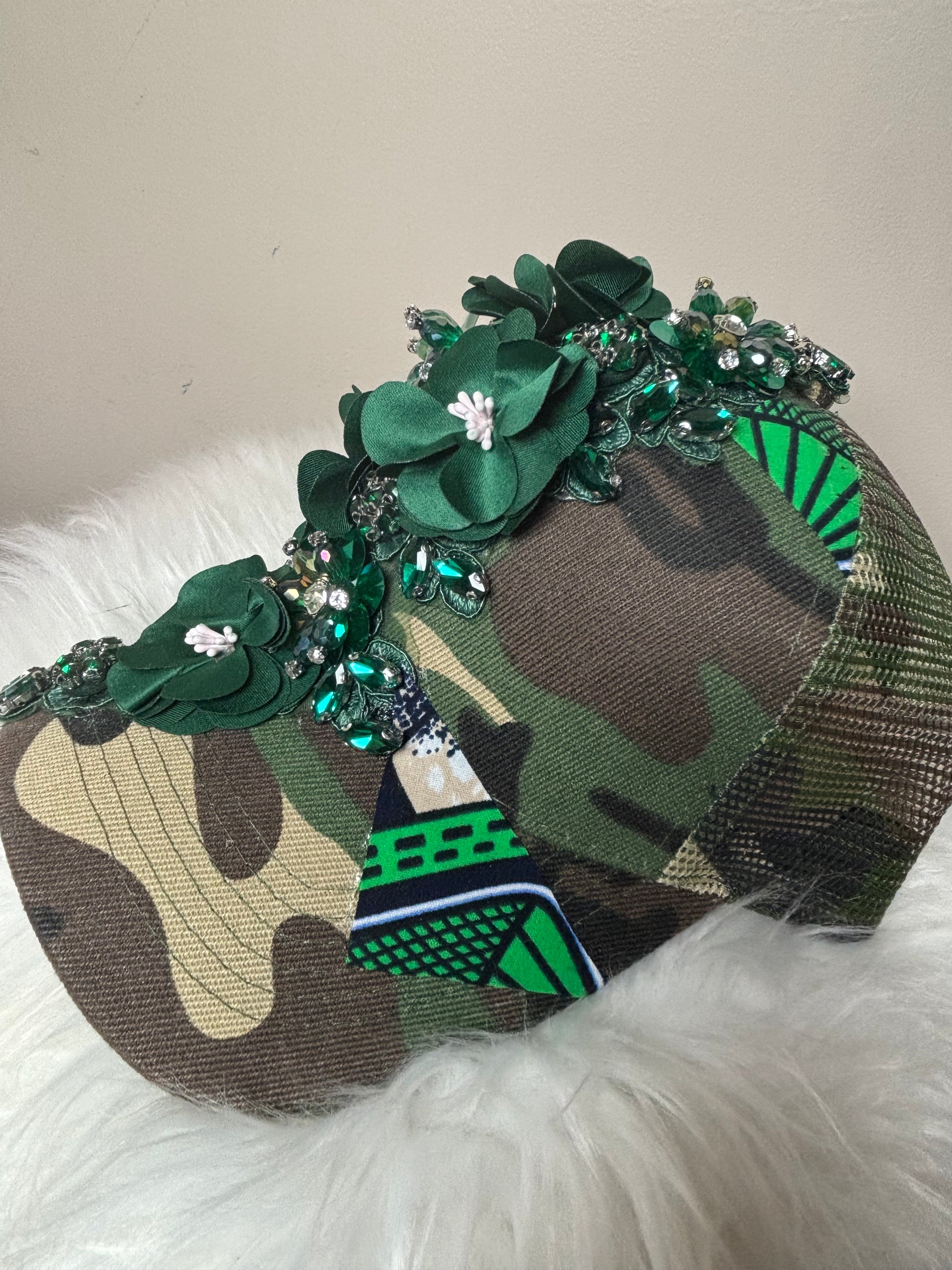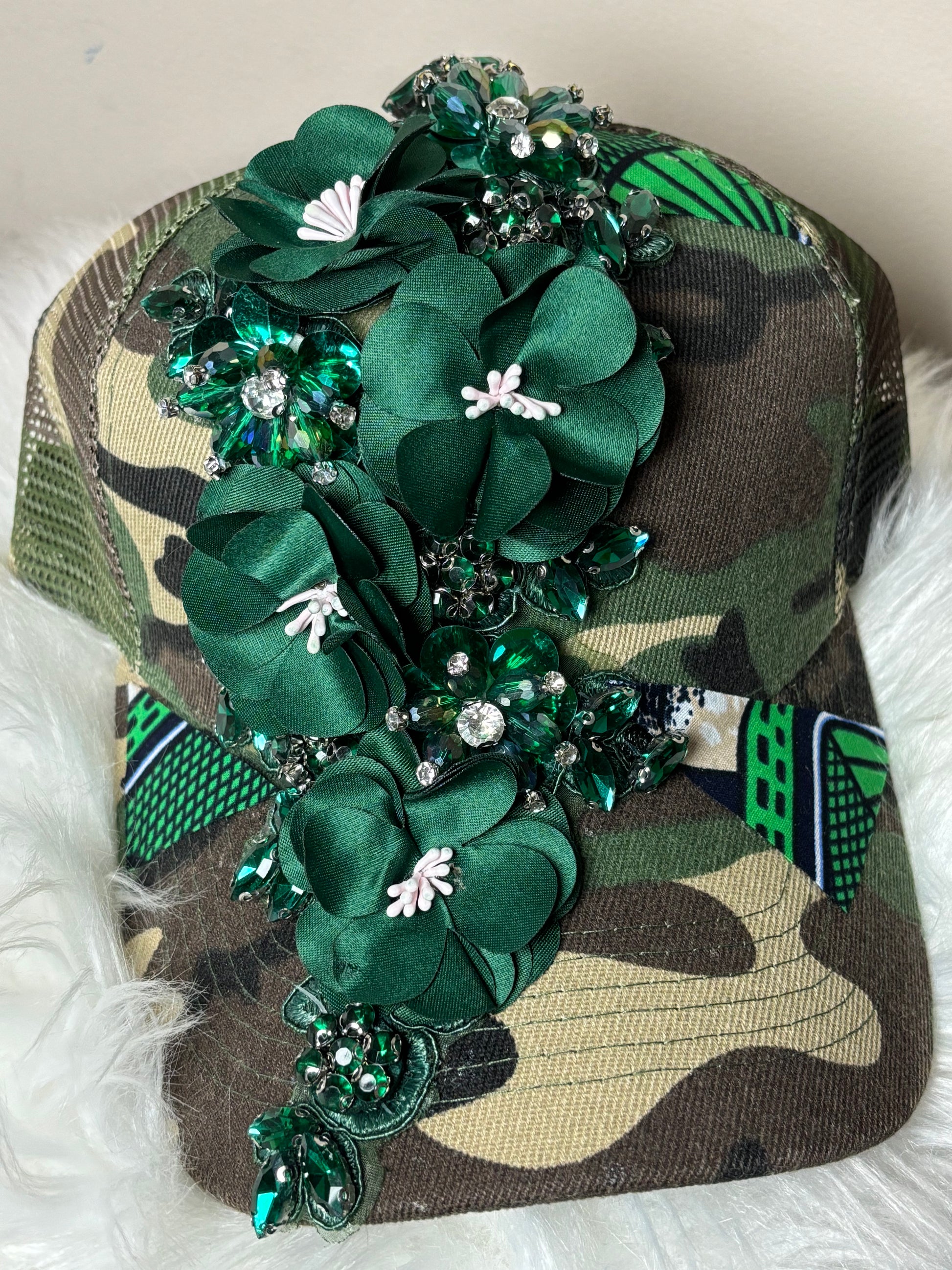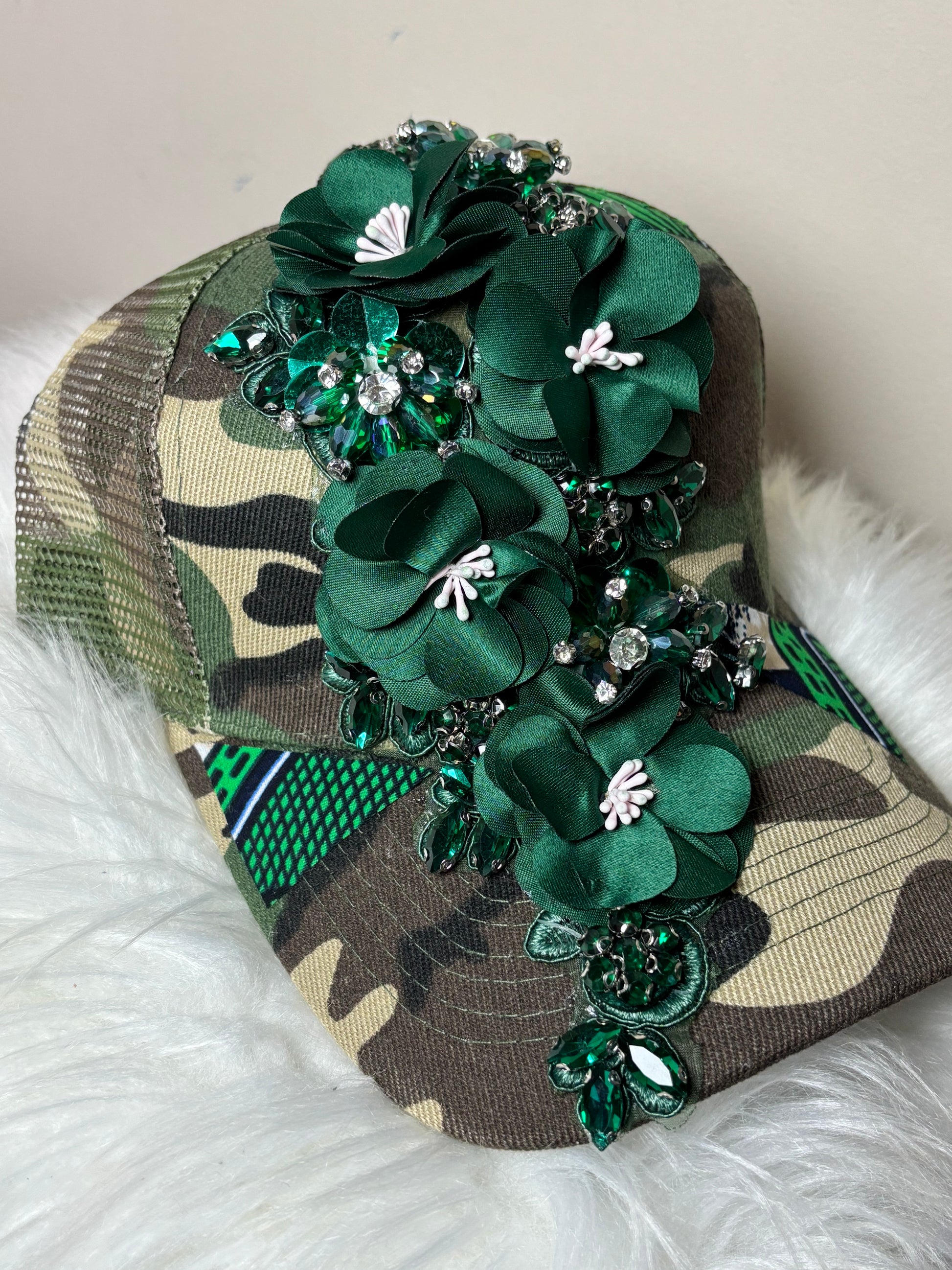 Step boldly into style with the Camille Forest Cap, where rugged camo meets luxe embellishment. This one-of-a-kind trucker hat is hand-adorned with lush green satin florals, sparkling rhinestones, and jeweled accents that cascade down the crown. Perfect for making a daring fashion statement, it blends streetwear edge with couture level detail turning everyday wear into standout flair.